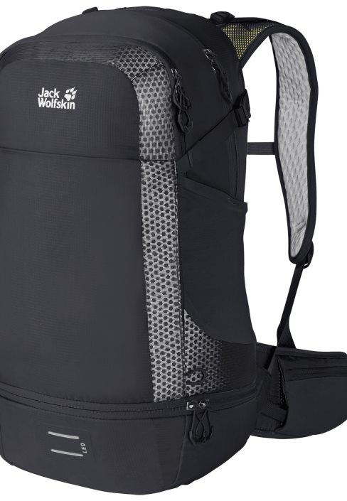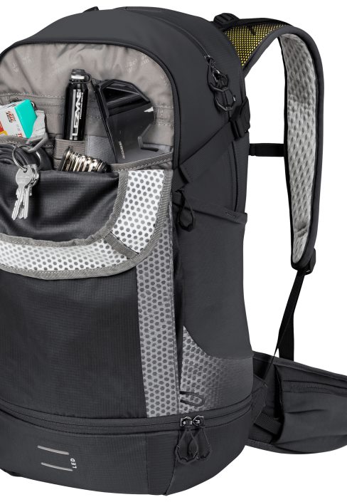 The MOAB JAM PRO 34.5 is the state of the art version of the modern bike pack and is suitable for multi-day trips. The lightweight AEROSHAPE back system is designed to give you total comfort and mobility. The pack sits very close to your body without restricting your freedom of movement. The central ventilation channel and the air permeable back padding cool your back as you move. The innovative one-piece construction has the additional advantage of keeping production waste to an absolute minimum. In addition, the mesh material we use is completely recycled, just like the main material and the lining. The stash pouches in the front pocket can be used for bike tools and accessories, and there’s an attachment for an LED light or air pump. The roomy main compartment has an elasticated front so the volume can be expanded a little. The main compartment is prepped to accommodate a water bladder, and the pack is also equipped with a base compartment, so there’s loads of room for your kit. The helmet carrier is located in a separate compartment on the front. As an additional safety feature, the pack is equipped with high-vis retroreflective detailing on the body and the shoulder straps.