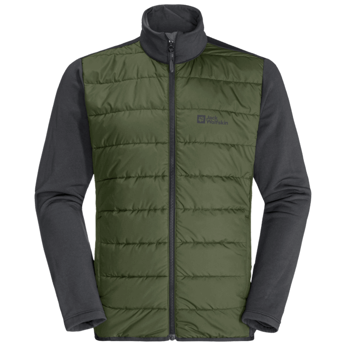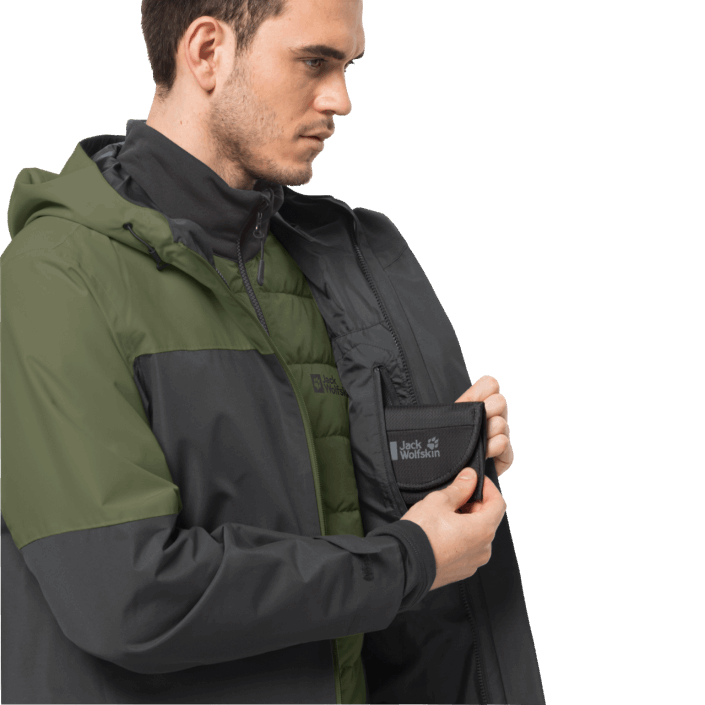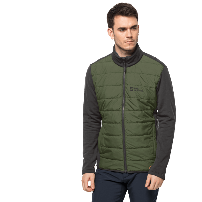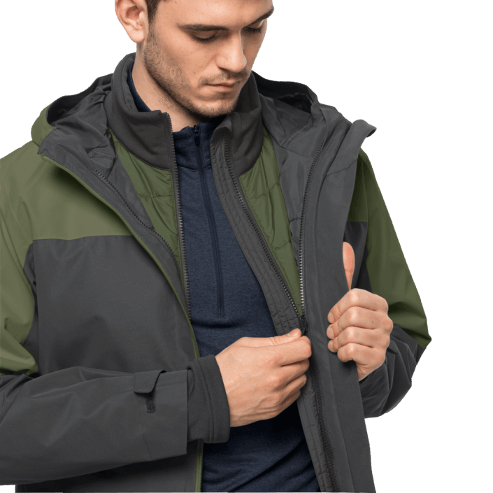 The warmth is provided by a zip-in hybrid inner jacket made of super stretchy fleece with a windproof, insulated front. This jacket is also breathable. The TEXATHERM CORE synthetic fiber insulation is made of recycled polyester.