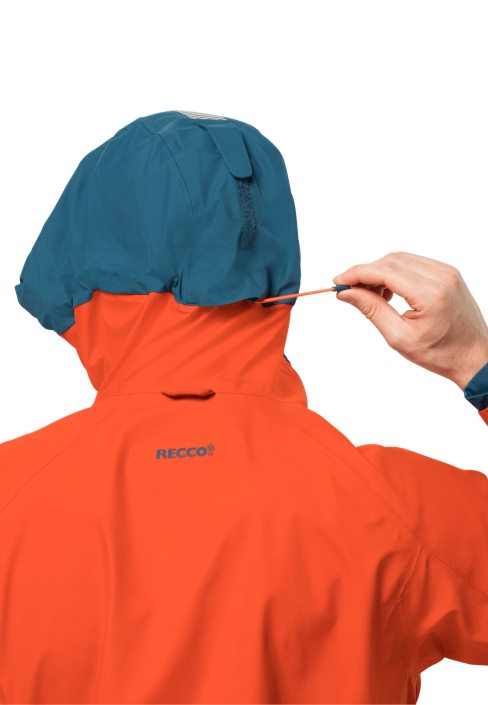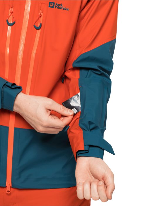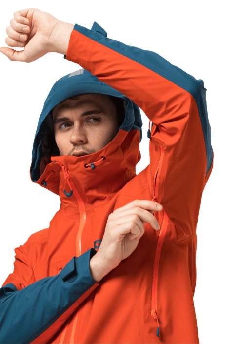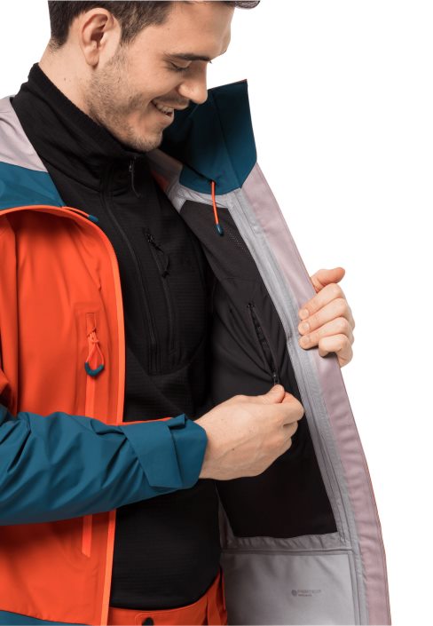 Alpine ski touring is even more fun when you’re wearing the ALPSPITZE hardshell jacket! Thanks to the PERTEX SHIELD AIR fabric, the jacket is waterproof and very breathable. The chest pockets are easy to access, even if you’re carrying a pack. And there’s a special pocket on the sleeve for your ski pass. The hood is adjustable and helmet-compatible, and has high-vis reflectors on the back. The RECCO chip makes it easier for the rescue services to locate you in an emergency.
